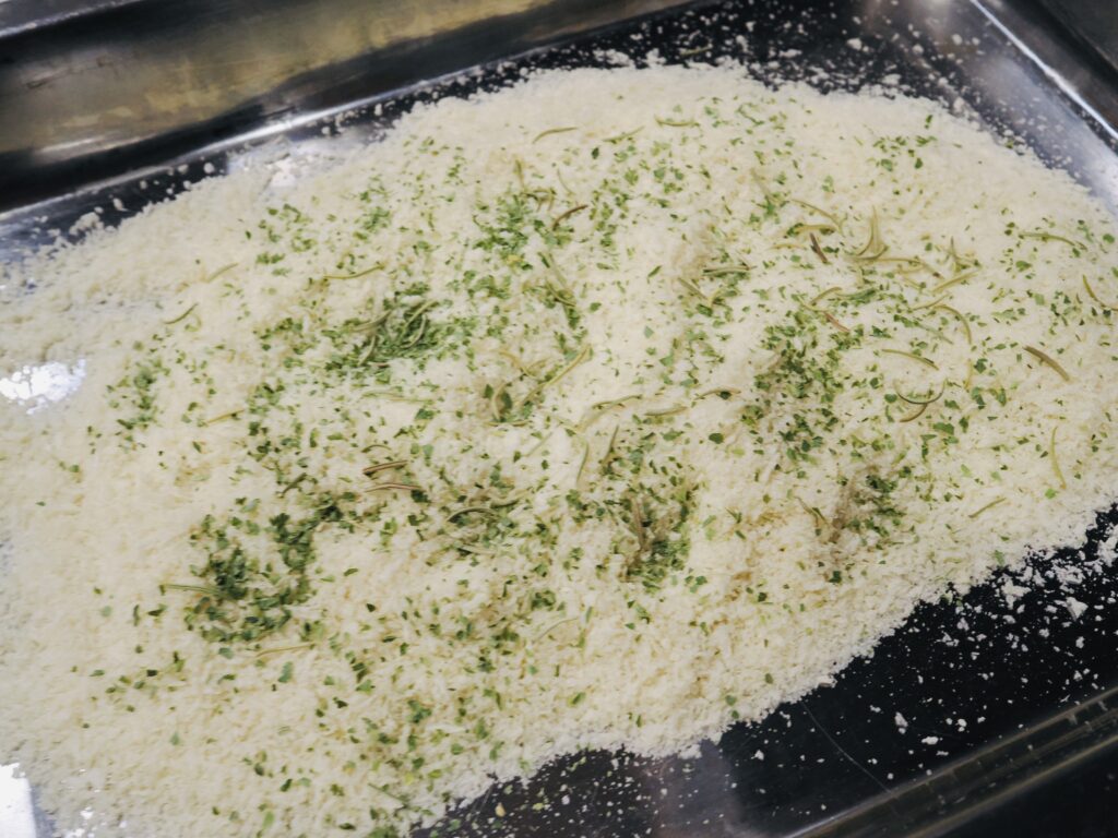 ②バットに適量のパン粉を広げて、ローズマリー・パセリを混ぜておく。