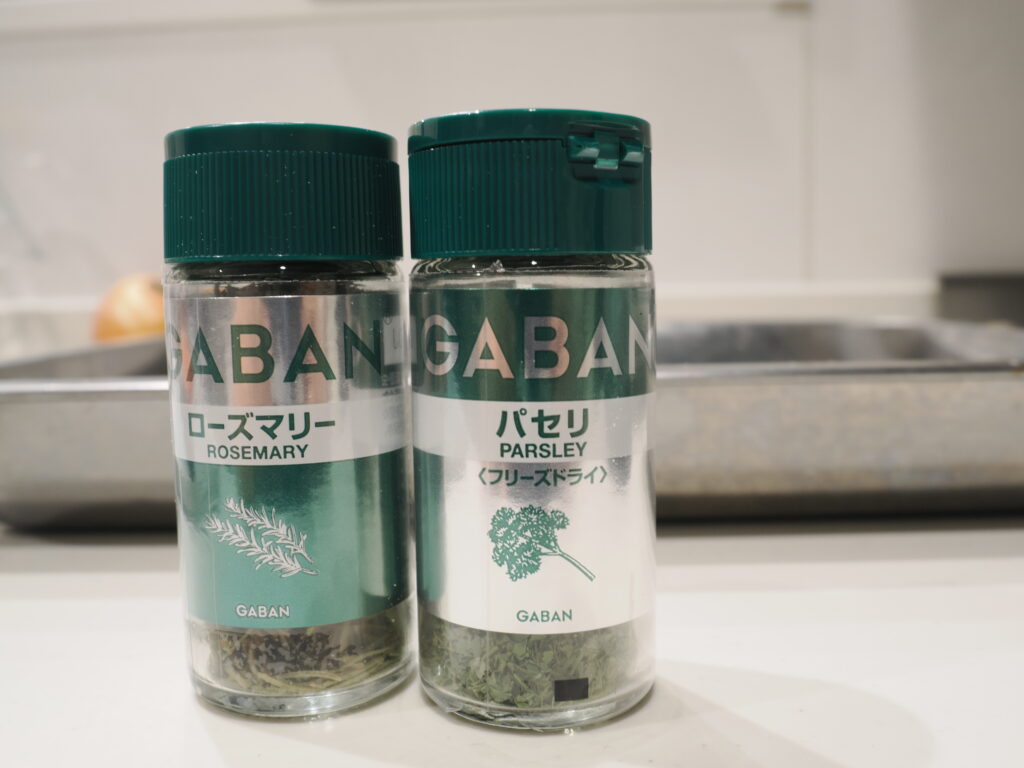 - ローズマリー(生のものはなかなか手に入らないと思うので、ビンのGA◯ANを使用)