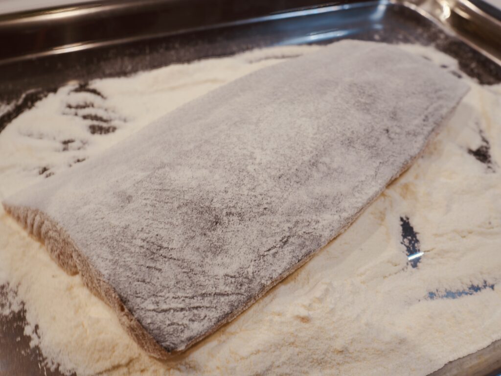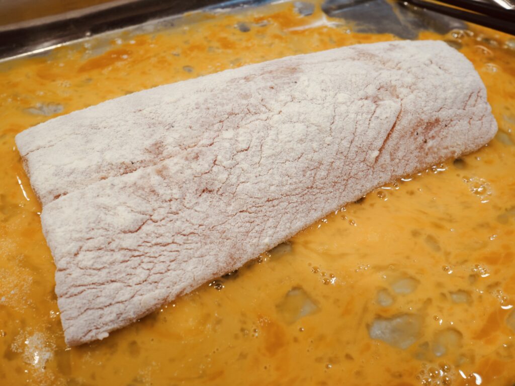 まぶした粉は、余分な粉がつき過ぎていると剥がれたりする原因になるので、まぶした後にポンポンと払い落として、両面にうっすらついているぐらいでOKです!