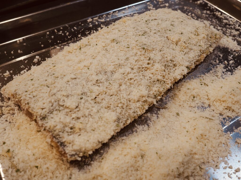 パン粉も全体につけるのではなく(お洒落に仕上げるのなら)卵のついた皮面だけに。ここはパン粉をしっかりつけたいので、身が崩れない程度にしっかり押さえてつけていきましょう。