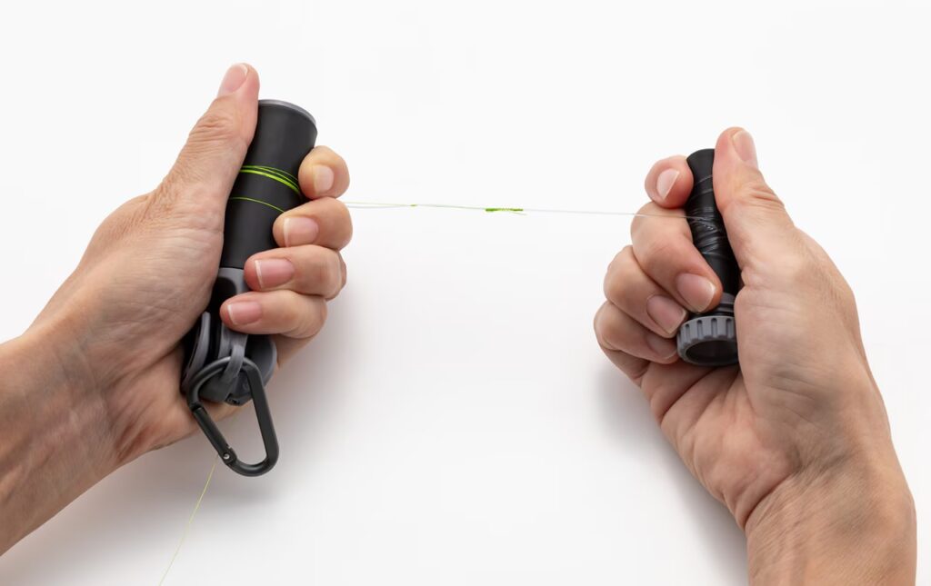 クルクルと回すと底からバーが。2分割する感じで、締め具として手をラインで切ったり痛めることなくノットを締め込むことができます。