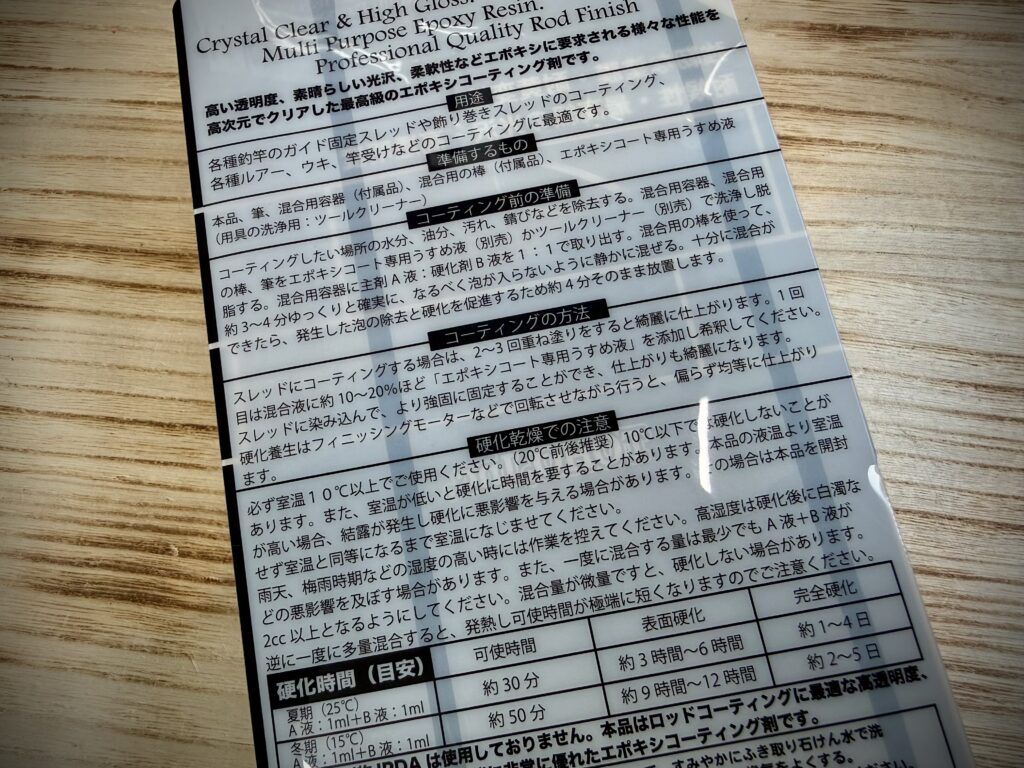 高い透明度・素晴らしい光沢・柔軟性と、エポキシに要求される性能を高次元でクリアした最高級のエポキシコーティング剤で、使用方法もパッケージ裏面に詳しく書いてありますので安心です。