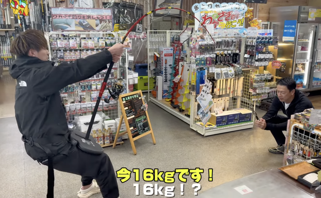 MONSTAの曲がりについ目が言ってしまいますが、(この時の負荷、約15kg程度で既に100kg程度のマグロが掛かったのと同程度)、当店健太氏は涼しい顔で保持しています!