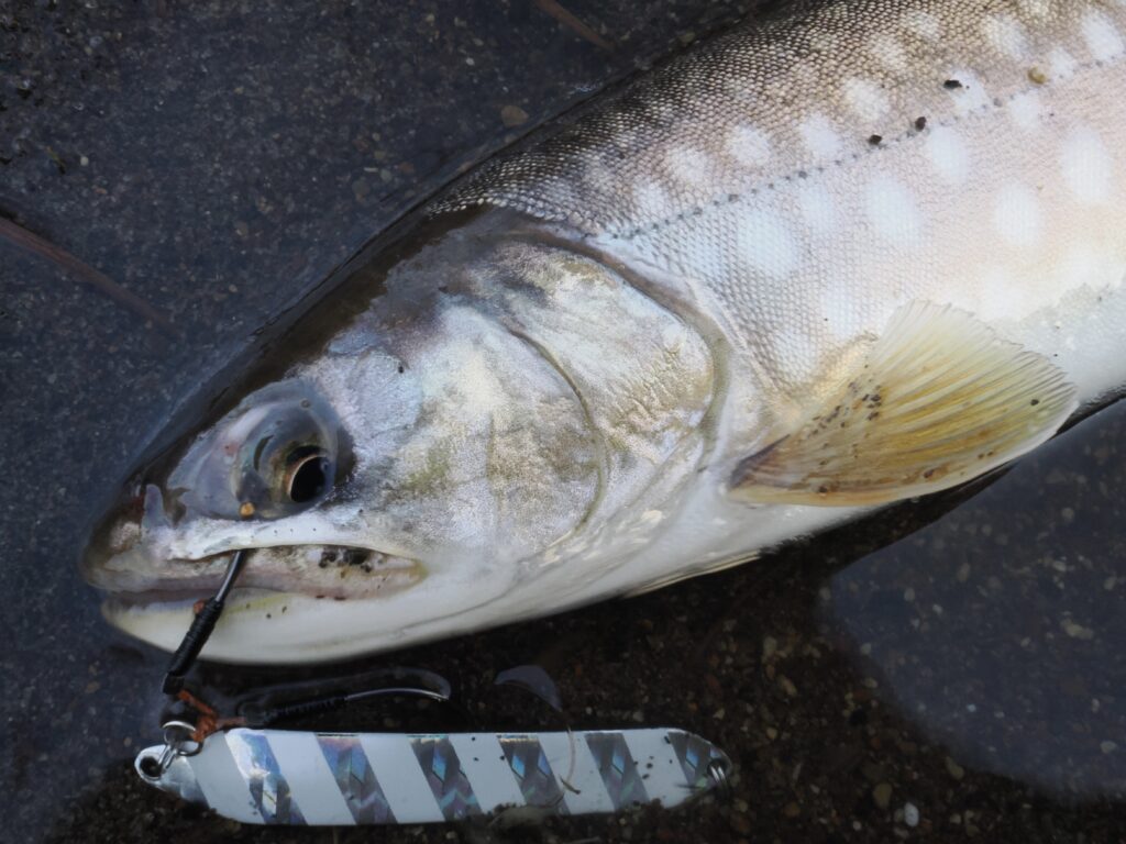 まだ薄暗いうちはやはりこのカラーが好き。ssyLabel "provia H#16 14g"。リフト&フォールにサイズは中々上がらないもののたくさんのアメマスが遊んでくれました。