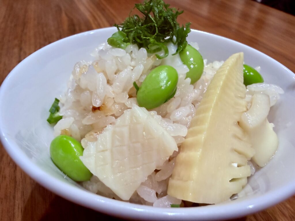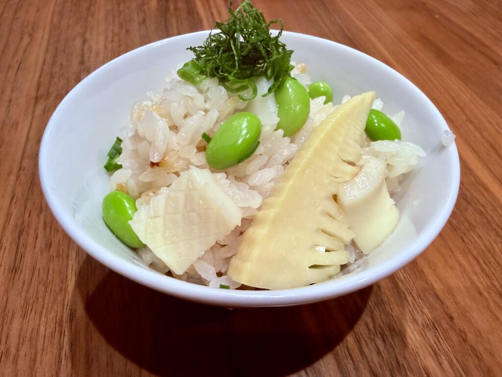 ドスイカは熱を加えてもさほど硬くならないのでちょうど良い食感。枝豆と筍の食感も最高です。仕上げの大葉とネギも香り良く、使ってほしい仕上げ薬味です。