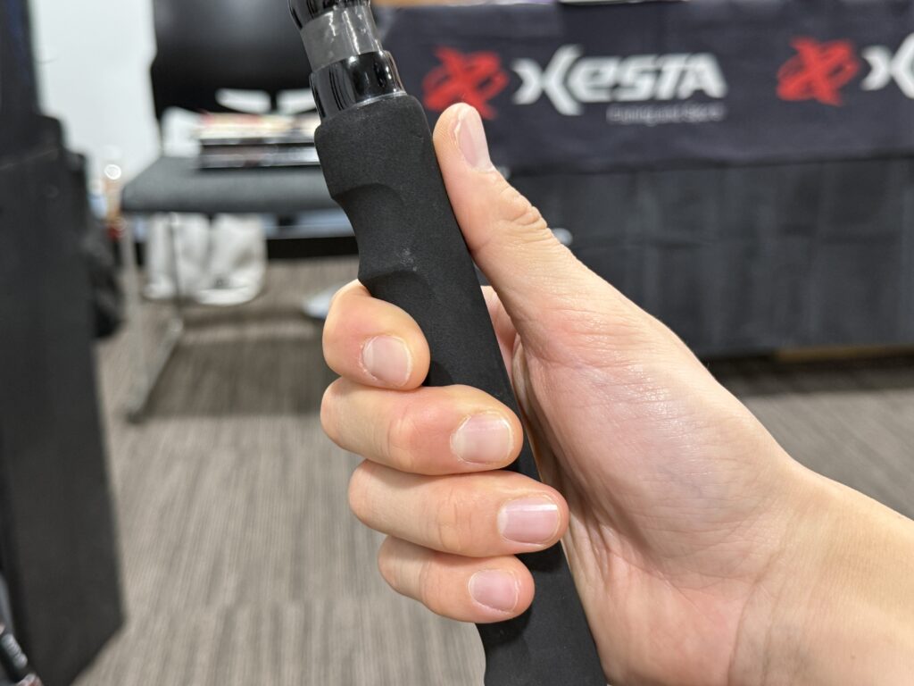 実際に持たせて頂き、ロッドをぶち曲げてもらったのですが、確かに握り込めるので楽な感じはしました。