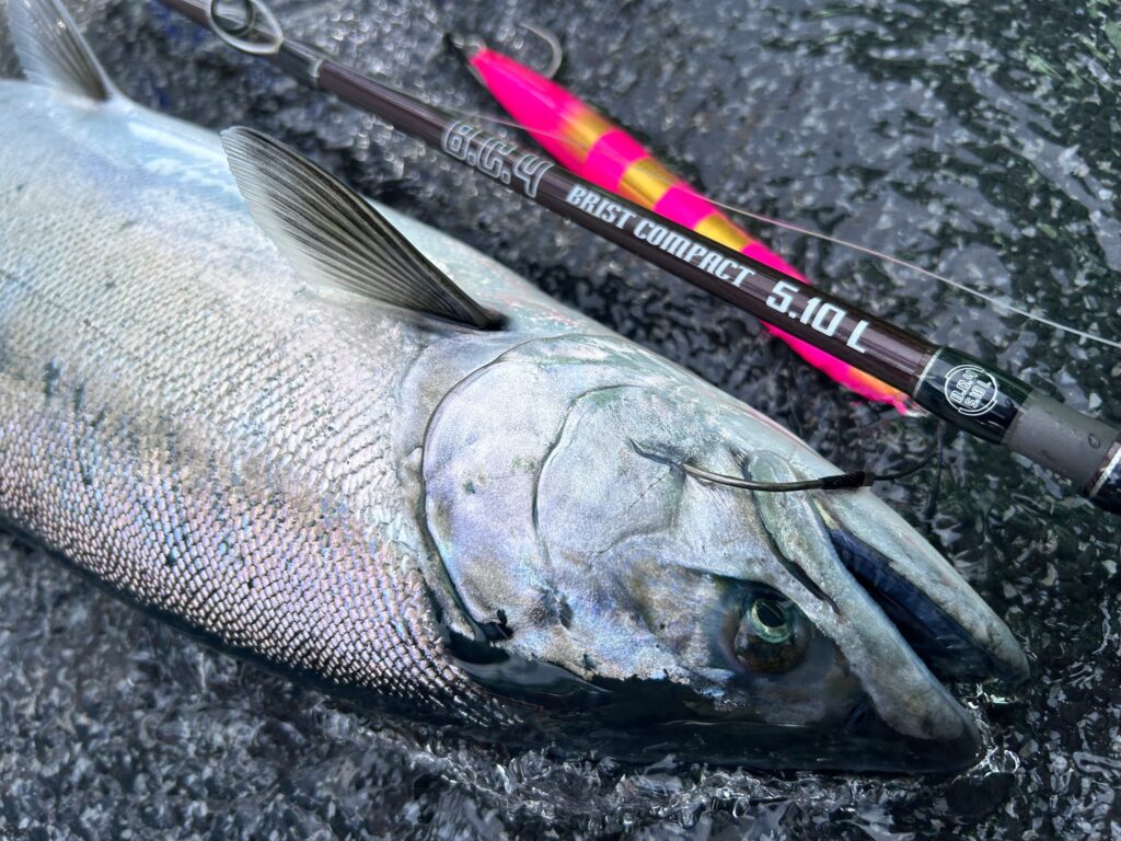 ジャークでしっかり持ち上げても、いわゆる"水平で止まる"動きにはならず、そのまま垂直フォールやスライドフォールヘスッと移行。この一連の動きが、なかなか口を使わないサクラマスに強烈に効きます!