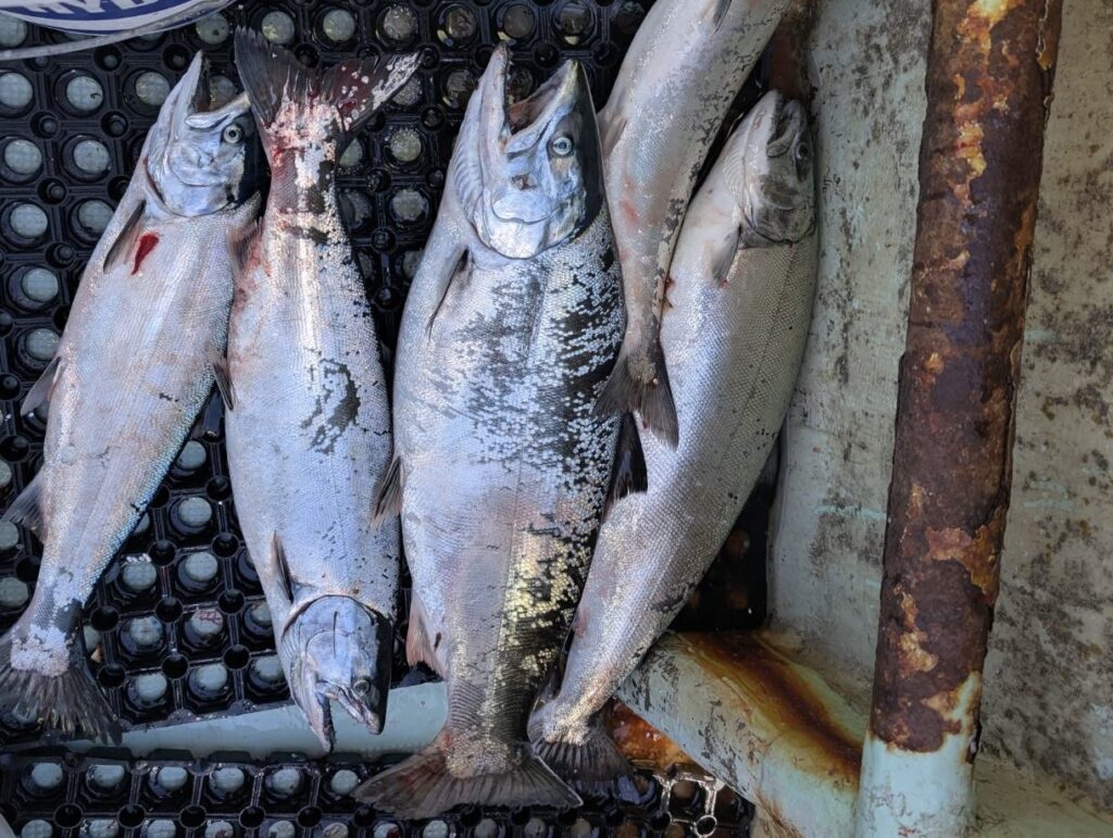 なんか1匹だけ体高すんごいやつがそうなんですが、掛かって上がってくるまではキングサーモンと勘違いもしたそうです(笑)。ちなみに、一番右のサクラマスは2.5kg越え。