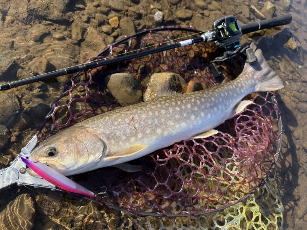 こちらは桜ピンクバックでキャッチした良型のアメマス。やっぱりアメマスにはこういったアピールカラーは絶対に欠かせませんね!迷ったらこのカラーで良いと思います!