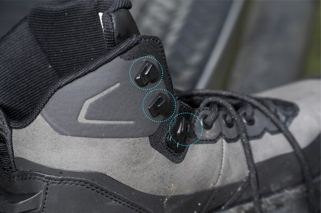 そして一番上部のフックは、好みのホールド感をキープできる固定式フックになっています。足首周りを締めあげた後、掛けると固定され、スムーズに紐を結べます。