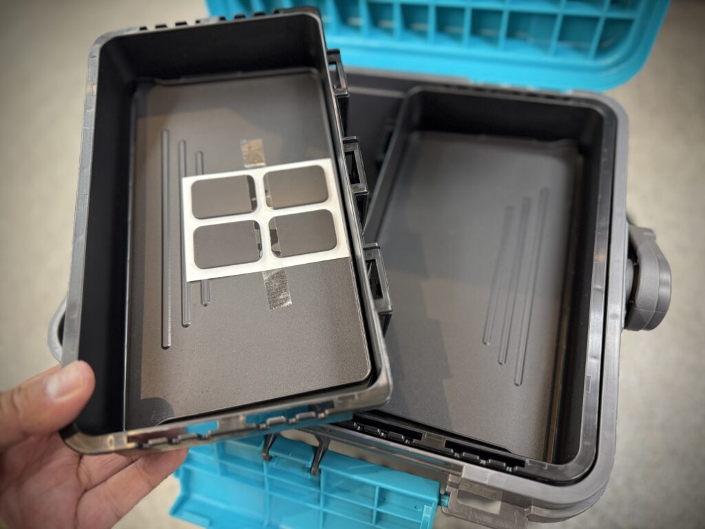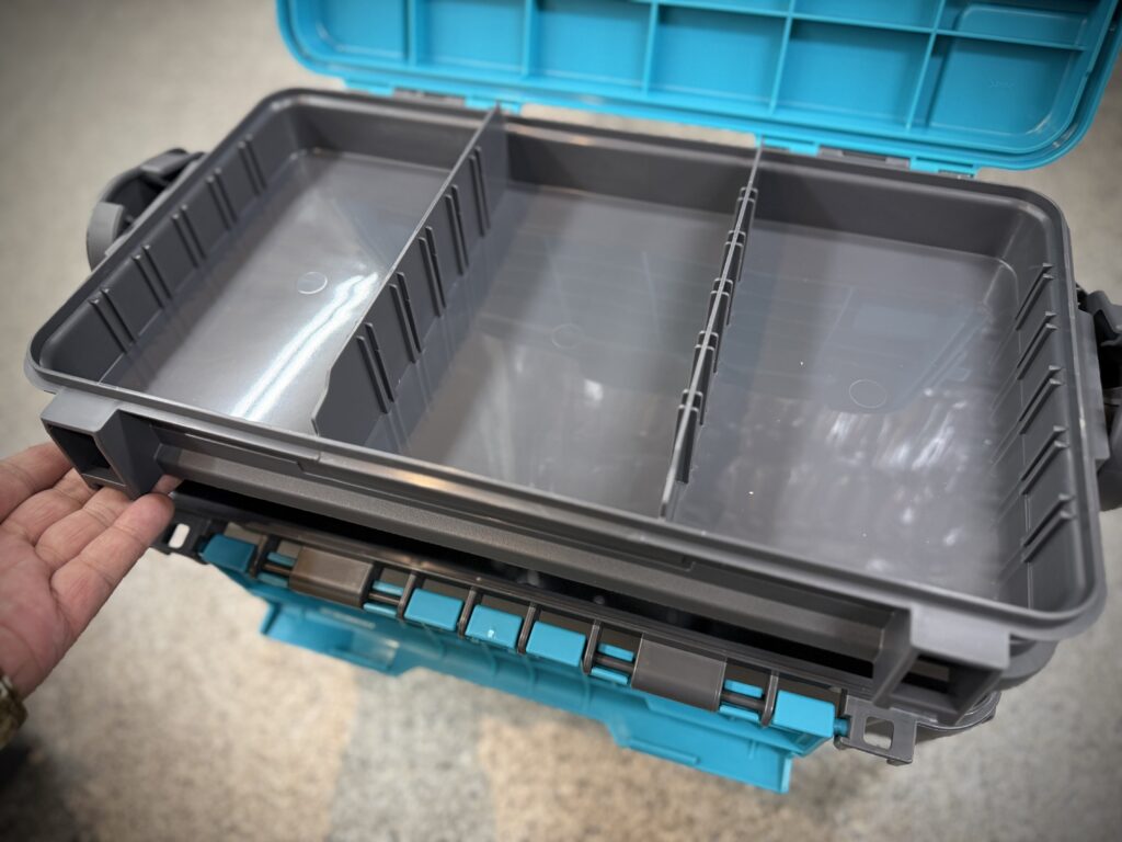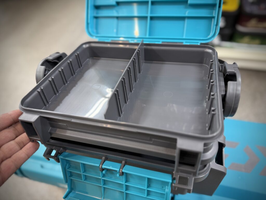 インナーケースにはフックが付いているので、ボックス外部に接続することができます!例えばオフショアサクラマスジギングでしたら、使用済みのジグの置き場としてや、ローテーションしたいジグをスッと交換できるように、このトレーにスタンバイしておくのもアリです。