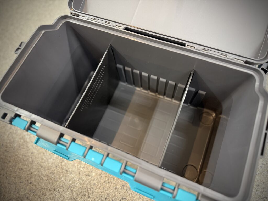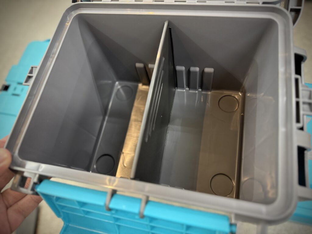 メイン収納もルアーケースや軽食入れておくのにもちょうど良いサイズ感です。仕切りもお好みで設置できます。