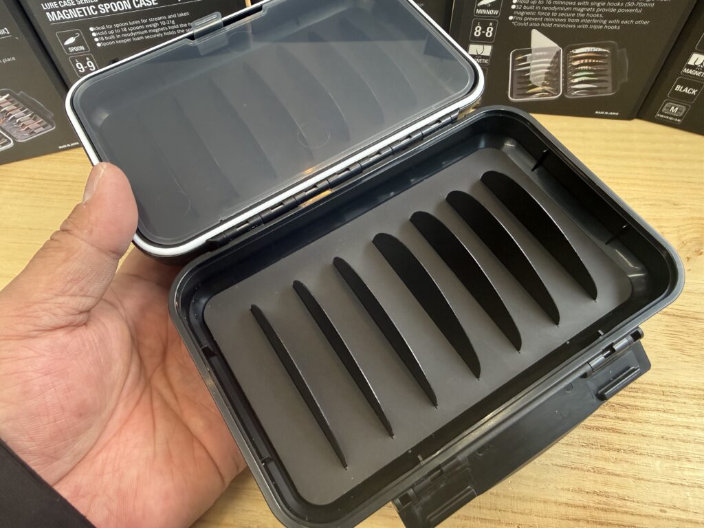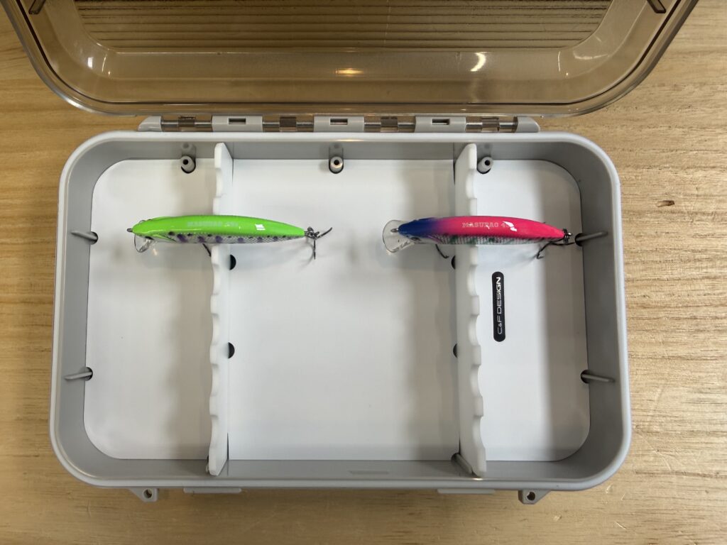 左右のクリア素材の中仕切りがあるのも嬉しいポイントですね。ハードに動いて、万が一マグネットから外れたとしても左右のルアーぐちゃぐちゃ事件を未然に防いでくれます。