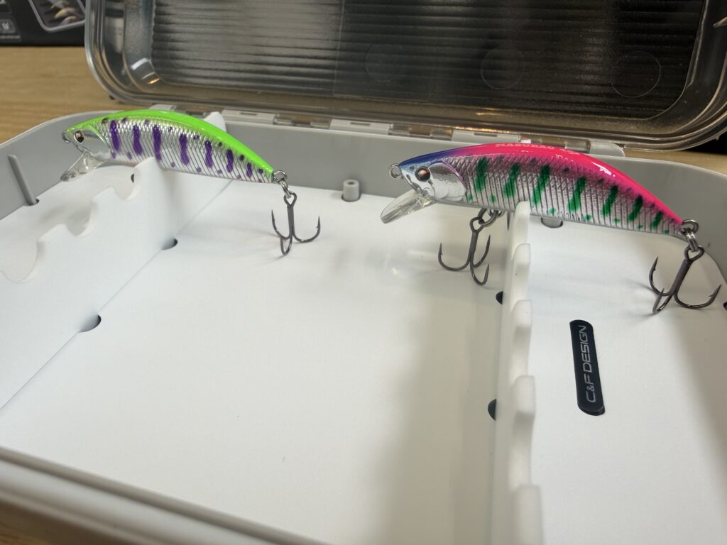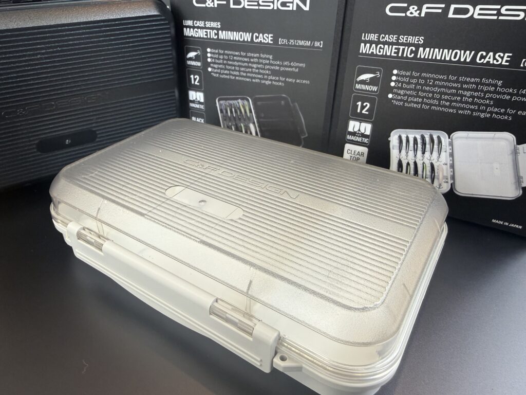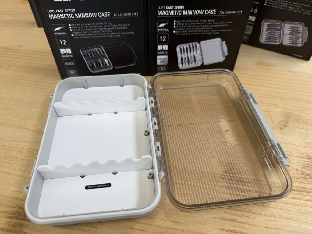 こちらは45mm~60mmのミノーが12本収納できるタイプ。底がホワイトのモデルは、TOPがクリア仕様となっています。