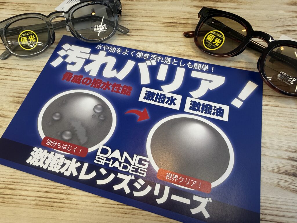 この2アイテムは激撥水レンズシリーズで、水や油をよく弾き、汚れ落としも簡単な視界をクリアに保ってくれるモデルです!しかもちゃんと偏光レンズ仕様!