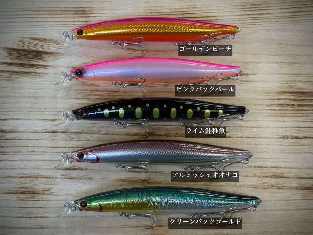 どれもまさに持っておきたいカラーラインナップ!マズメ時はピンクバックパールやゴールデンピーチ。日が昇ったタイミングでナチュラルなアルミオオナゴやグリーンバックゴールド。そして個人的にもめっちゃいいなと思ったカラーがこのライム鮭稚魚。