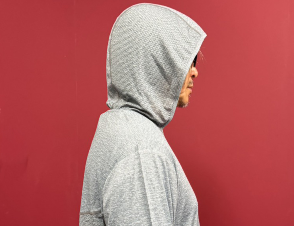 また、フードはキャップなどをかぶっても額まで覆う長さがあり、風にも飛びにくい形状となっている。