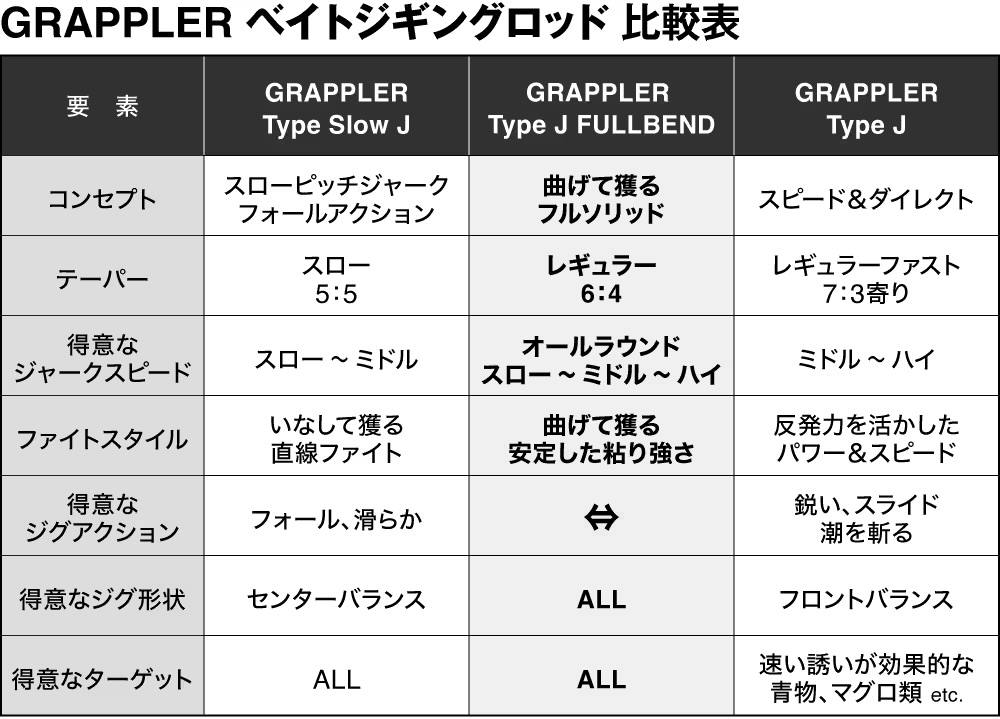 曲げて獲ることを存分に楽しめるGRAPPLER Type J FULLBENDは、グラップラーシリーズの中ではちょうど間に入るオールラウンド的な立ち位置で、フォールを意識したジグ操作や、クイックな上げ操作にも対応する万能型ですね!