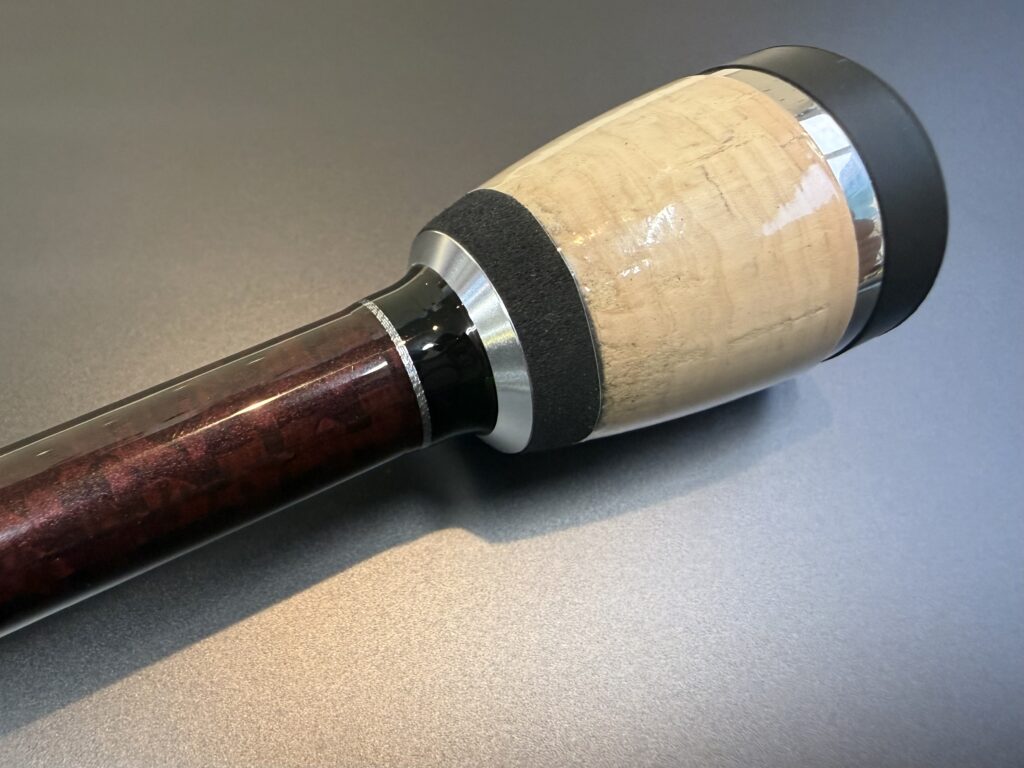 ごく短くデザインされたブランクスタッチのリールシート以降は、ティップからセンターを通って伝達された情報を硬質な金属感のように指先、手のひらへと伝え、刹那の電撃フッキングを可能にしている。